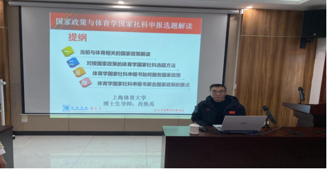 肖焕禹教授作题为《国家政策与体育学国家社科申报选题解读》的专题讲座,从当前与体育相关的国家政策解读、对接国家政策的体育学国家社科选题方法、体育学国家社科申报书如何服务国家政策、体育学国家社科申报书契合国家政策的要点等方面进行详细介绍,并结合自身经验从评审程序和选题等角度对体育学院申报的项目选题进行了指导。