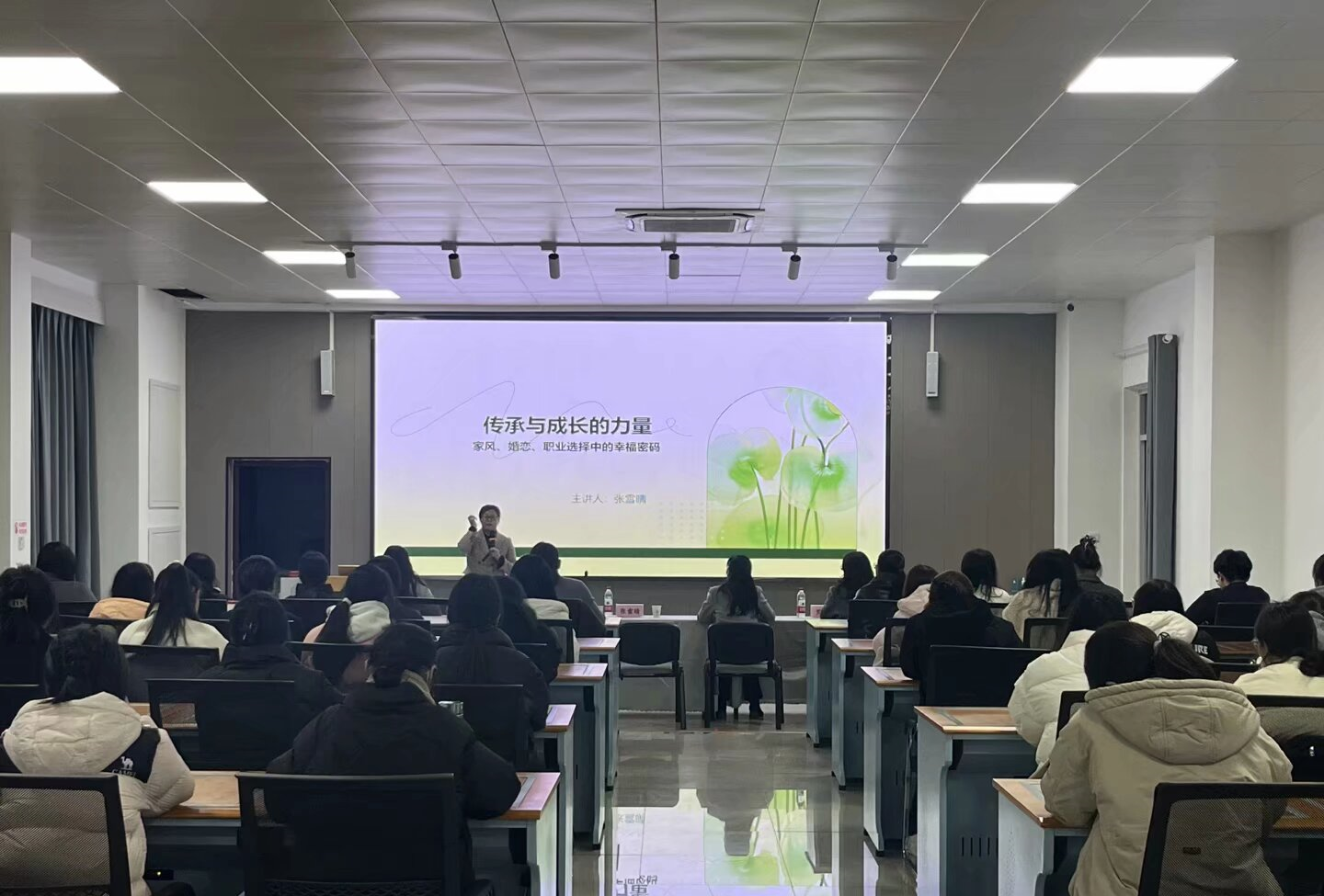 张雪晴作题为“传承与成长的力量”的报告,从心理学的角度讲诉了家庭的陪伴模式、沟通模式、情绪模式对家风形成的作用;从婚恋观的角度阐述了家庭对婚姻选择的影响;从文化观的角度分析了家风对就业观念的塑造。讲座案例鲜活、内容丰富,对于启示当代大学生汲取优良家风的营养,成长为最好的自己具有重要作用。