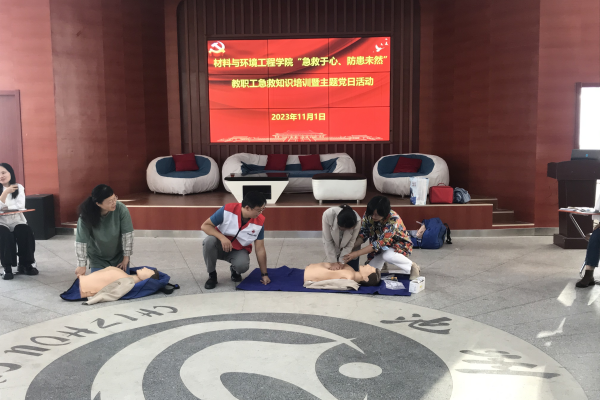 11月1日下午,材料与环境工程学院在大学生活动中心开展“急救于心、防患未然”教职工急救知识培训暨主题党日活动。此次活动邀请池州市红十字会两位讲师现场教学,两位讲师通过浅显易懂的语言和现场示范,为学院老师们讲解了救护概念、创伤救护、心肺复苏突发事件和常见意外伤害等方面的知识,并就心肺复苏和海姆立克急救法的步骤和要点进行现场示范,学院老师们认真听讲并积极操作练习。