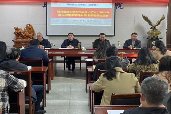 11月29日下午,马克思主义学院党委理论学习中心组(扩大)在博爱楼南二楼会议室举行了2023年第11次集中学习会。学院党委书记刘为国、副院长鲍红信、副书记周佩东、挂职副院长李志江及全院全体教职工参加会议。刘为国主持会议。