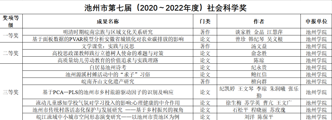 近日,池州市第七届(2020-2022年度)社会科学奖评选结果公布,全市共评选出获奖成果18项。beat365共12项成果获奖,其中一等奖2项,二等奖3项,三等奖7项,再次实现新的突破。