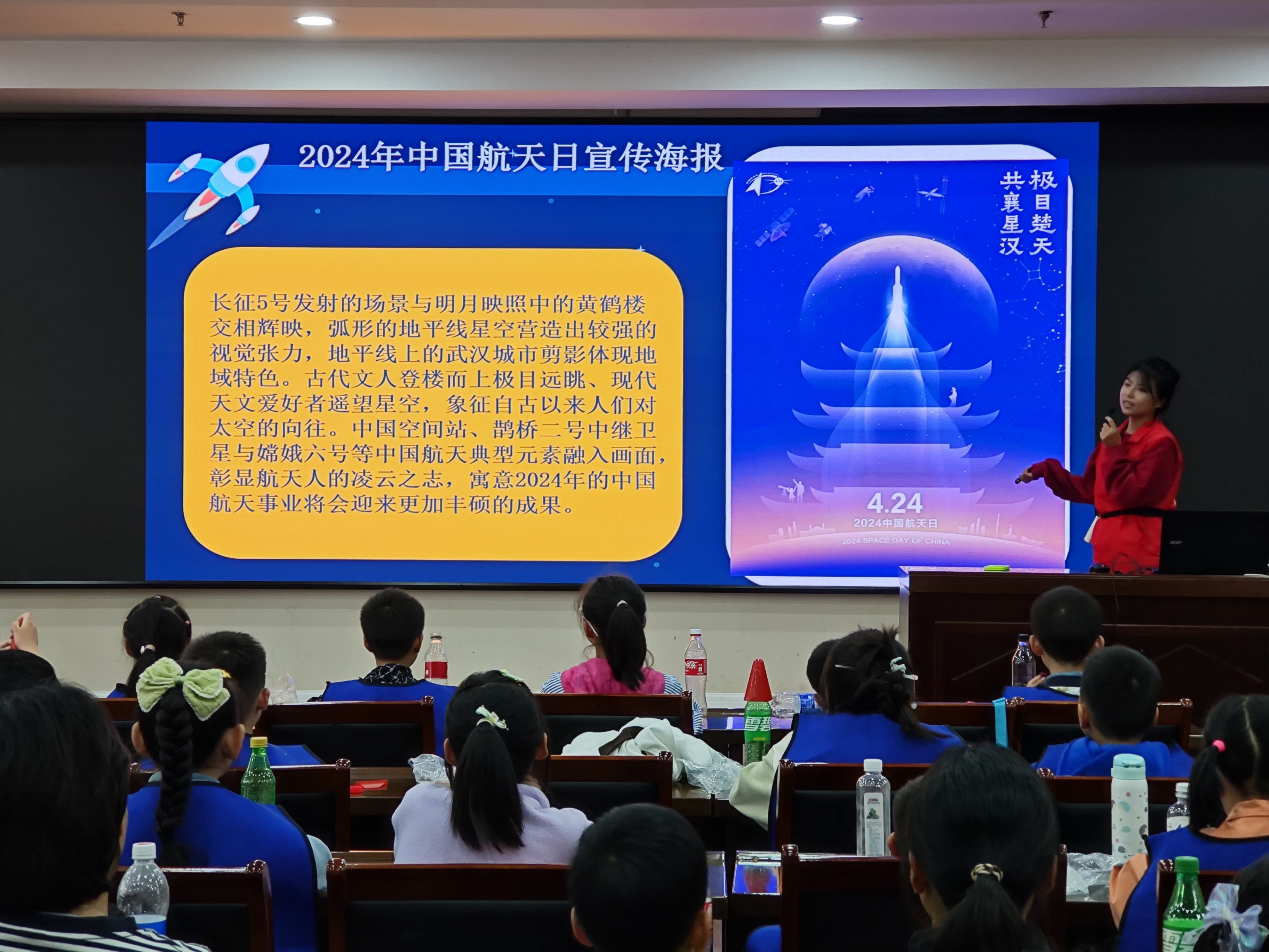 在科技馆五楼,志愿者讲解了2024年中国航天日宣传海报的含义、古代对于飞天的幻想、太阳系八大行星、中国航天的艰难发展之路、天空小课堂、水火箭和淀粉火箭特点等方面的知识,并现场示范并指导同学们动手制作水火箭。同学们认真倾听,仔细操作,顺利完成了制作任务。
