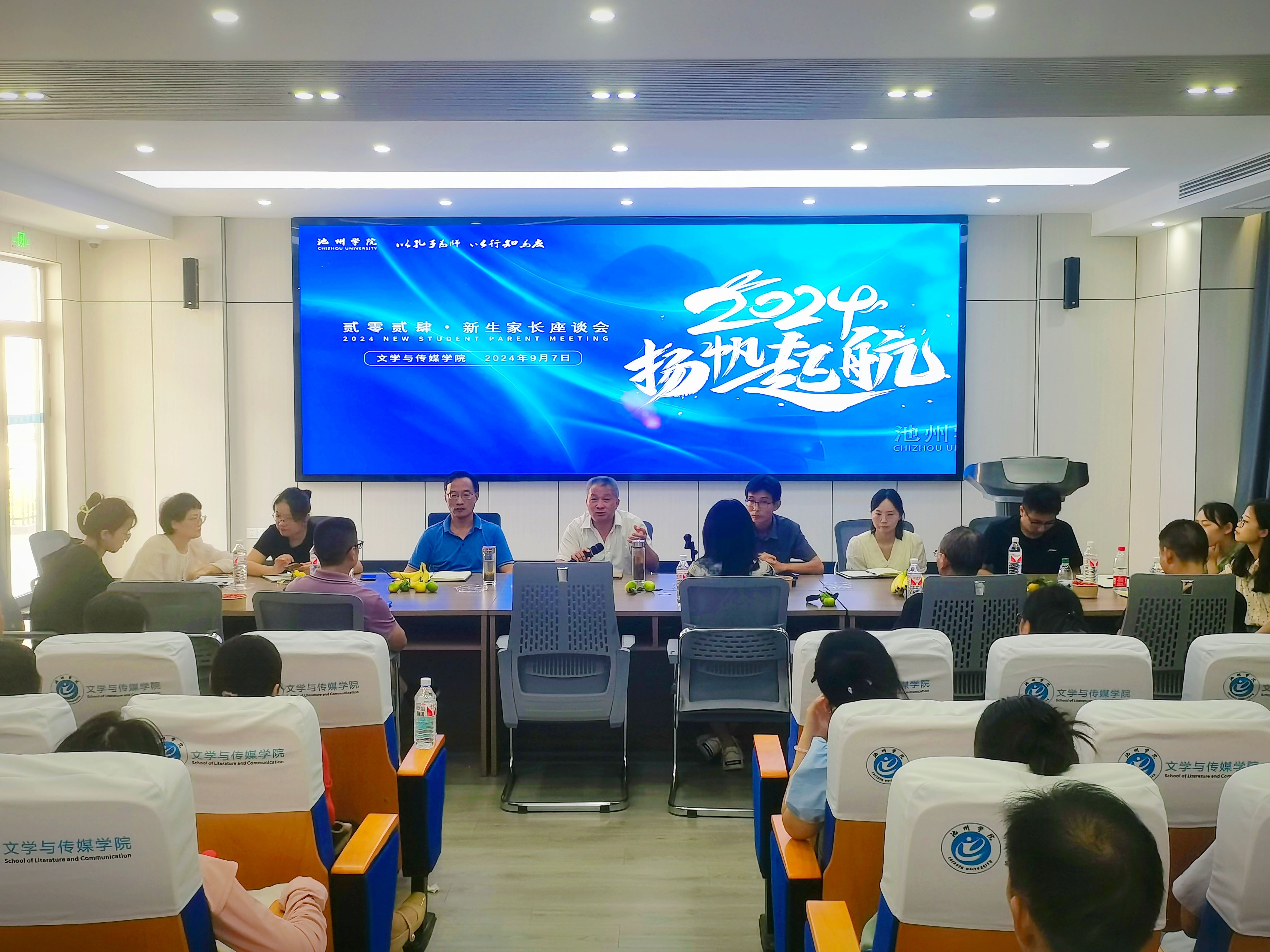 为有效落实立德树人根本任务,构建家校育人新生态,9月7日下午,文学与传媒学院在博物楼视听实训室举办了2024级新生家长见面会。学院党委书记许思友、副院长高祥华、党委副书记刘德群,学工办主任李九云、团委负责人,新生辅导员,新生家长参加座谈会。会议由刘德群主持。