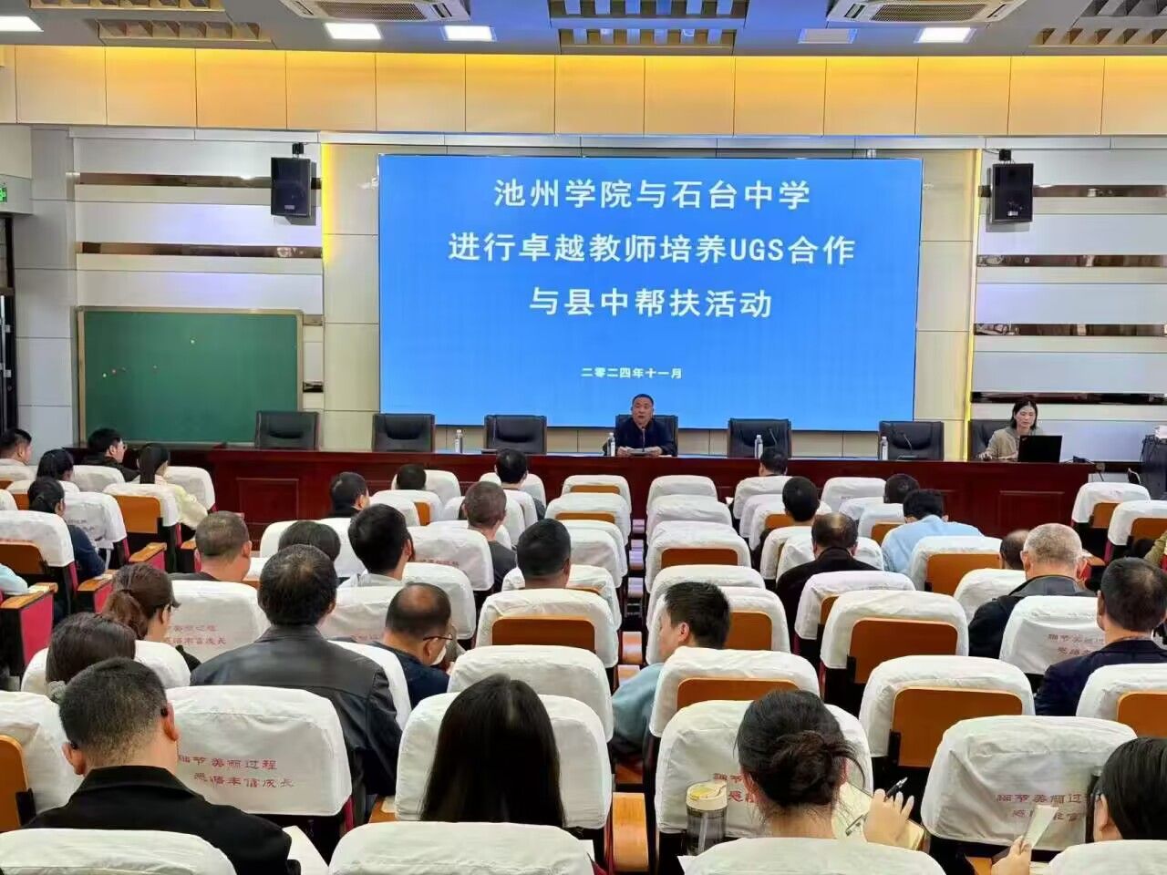 11月13日下午,文学与传媒学院副教授刘纯丽老师赴石台中学参加“beat365在线唯一官网登录与石台中学卓越教师培养UGS合作与县中帮扶活动”并做专题讲座。石台中学党总支书记徐礼义、副校长吴祥生、杨勇、吕毅辉及全体教职工,学校汉语言文学专业在石台中学实习生参加了活动。