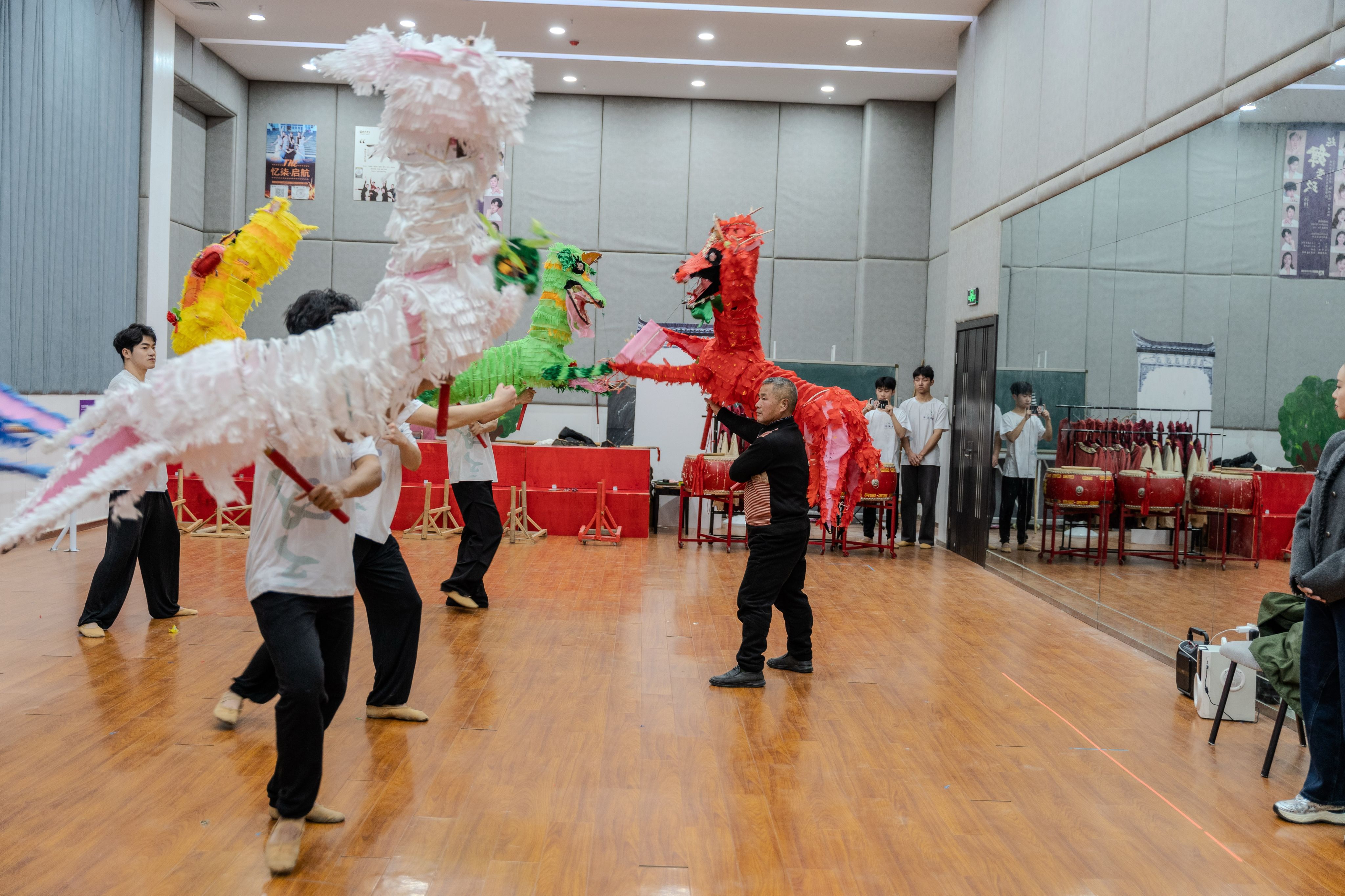 此次拍摄与收录工作,充分展示了学院师生在非遗文化上的研究成果。交流过程中,黄杰海老师结合六兽灯舞的文化内涵和舞蹈特点,对剧目细节提出了专业指导,“在舞动花灯过程中应保证六兽灯一直处于摆动状态,不能停止。”“举灯的时候脚下马步应该更扎实,重心要低。”通过黄老师的教授,使得我们领悟到六兽不仅是一种文化符号,更是人民群众心中有生命的神兽,是一种心灵寄托。