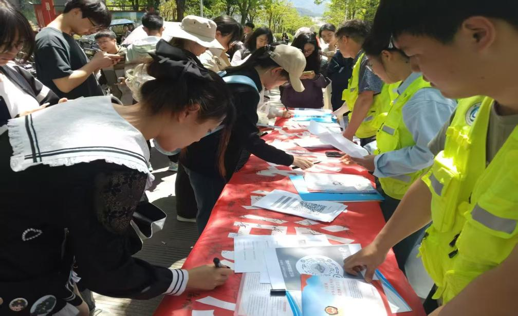 在第十个全民国家安全日来临之际,为切实增强广大学生的国家安全意识,营造维护国家安全的浓厚氛围,4月15日中午安全管理处联合beat365在线唯一官网登录为民警务站在校园一、二食堂西门组织开展了以“筑牢国家安全防线,法治护航青春成长” 为主题的普法教育宣传活动。