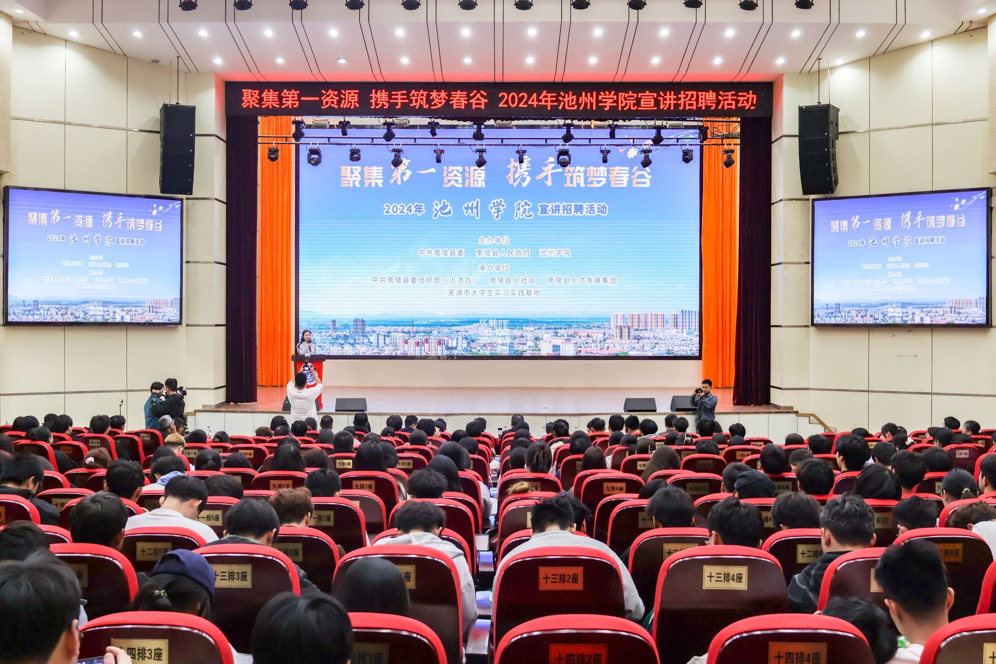 座谈会后,“聚焦第一资源,携手筑梦春谷”beat365在线唯一官网登录专场宣讲招聘会在博古大礼堂举行。现场推介了南陵县情,宣介了芜湖市及南陵县人才政策,为6名“南陵县校园青年引才大使”颁发了聘书。
