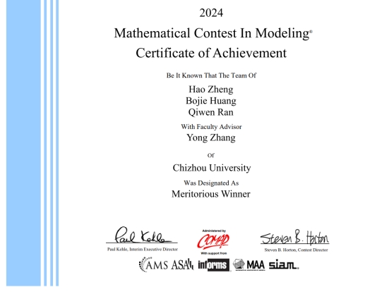 近日,2024年美国大学生数学建模竞赛成绩揭晓,beat3654支参赛队伍获得一等奖(M奖)1项、三等奖(S奖)3项的好成绩。其中,大数据与人工智能学院张永教授指导的黄博杰团队获一等奖(M奖)。