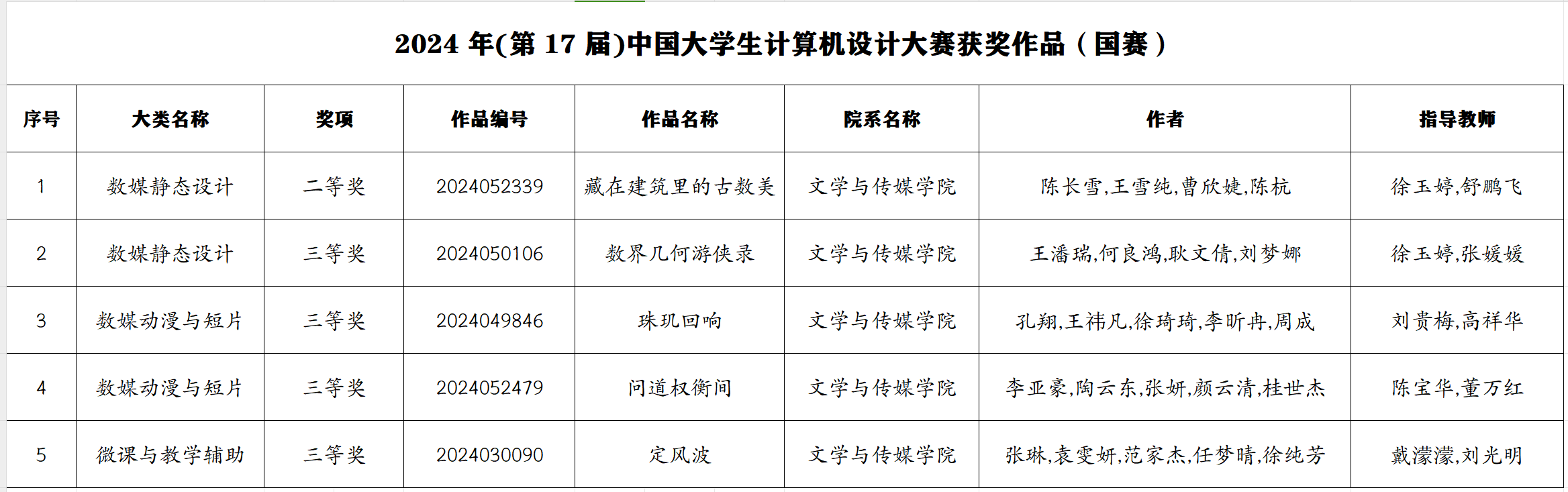 9月9日,2024年第17届中国大学生计算机设计大赛的总评审工作落下帷幕。beat365文学与传媒学院共有5件学生作品入围获奖,取得国家级二等奖1项、三等奖4项的优异成绩。