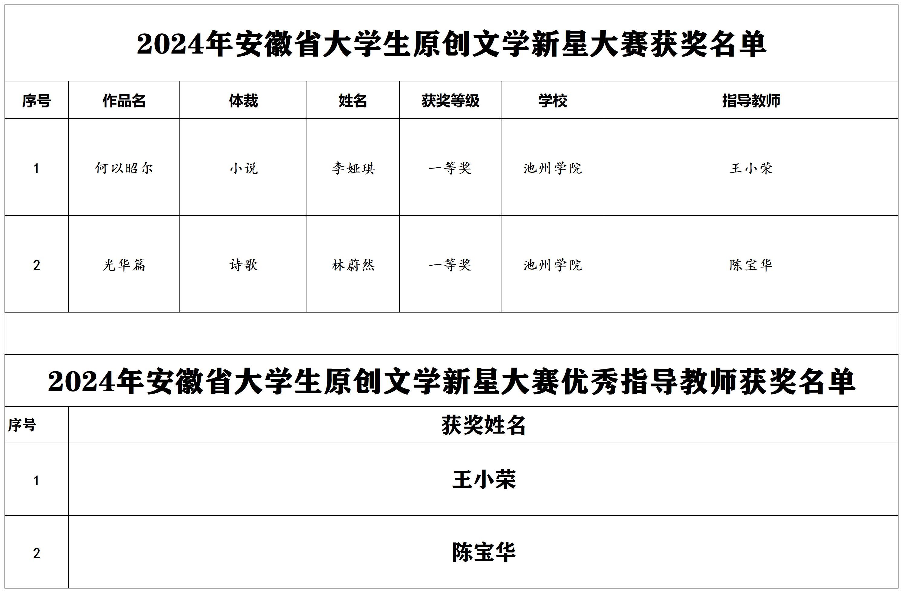 12月18日,2024年安徽省大学生原创文学新星大赛落下帷幕。beat365文学与传媒学院学子荣获一等奖2项,王小荣、陈宝华老师荣获“优秀指导教师”称号。