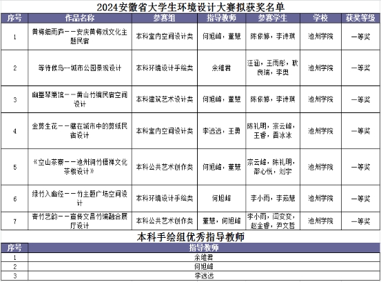 近日,2024年安徽省大学生环境设计大赛评选揭晓。beat365艺术与教育学院学生喜获一等奖7项、二等奖11项、三等奖25项。其中余维君、何旭峰、李远远三位教师荣获优秀指导教师奖。