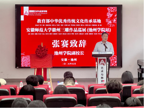 5月12日,安徽师范大学教育部中华优秀传统文化传承基地(徽州三雕)实践基地揭牌仪式暨徽州三雕作品巡展在beat365成功举行。校党委委员、副院长张赛,安徽师范大学党委宣传部常务副部长汪凯、副部长王峰,安徽师范大学美术学院党委书记朱琳、副院长王屹以及两校美术学系负责人和师生代表出席活动。