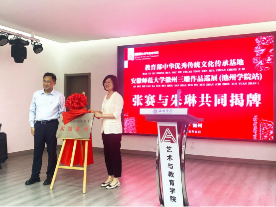 仪式上,张赛与朱琳共同为实践基地揭牌。揭牌仪式结束后,与会代表共同观摩了60余件徽州三雕巡展作品。