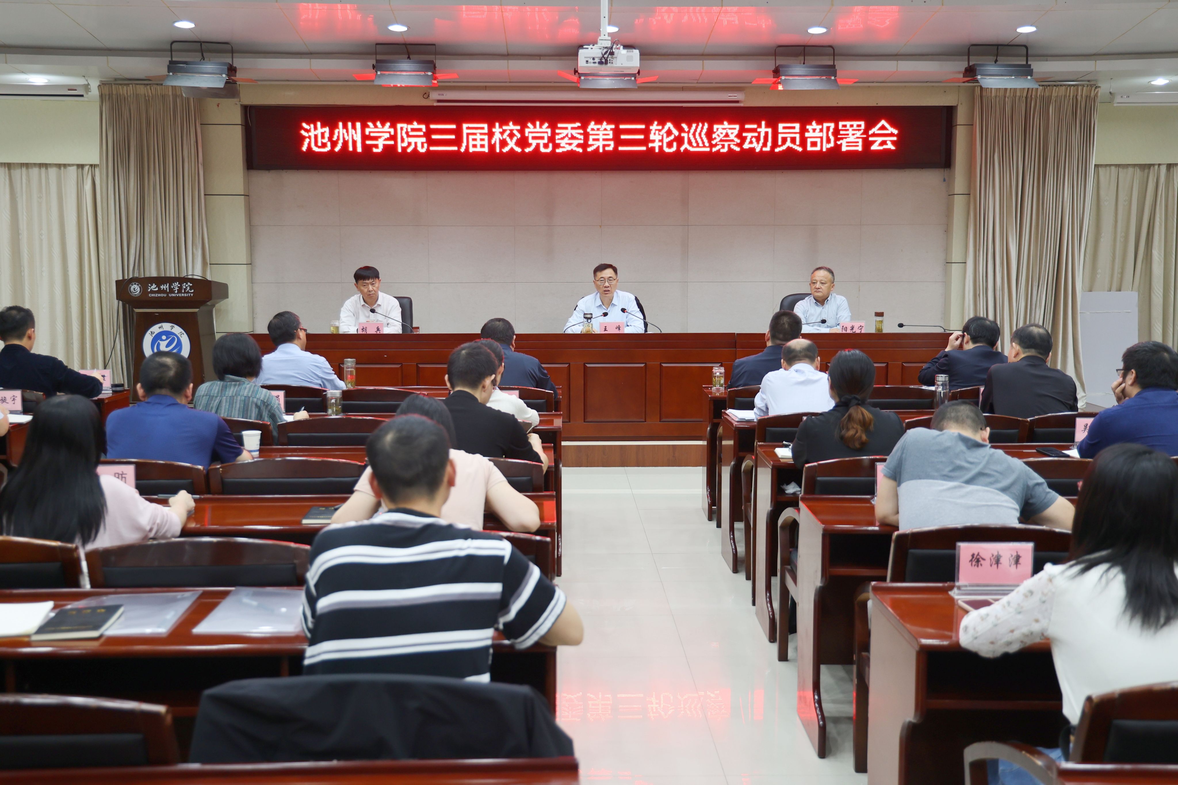 10月18日,学校在办公楼南二楼会议室召开三届校党委第三轮巡察工作动员部署会。校党委书记王峰出席并作动员讲话。校党委委员、副校长阳光宁,校党委委员、党委组织部部长胡兵出席会议。校巡察工作领导小组成员,各部门主要负责人、被巡察单位领导班子成员以及巡察组全体成员参加会议。