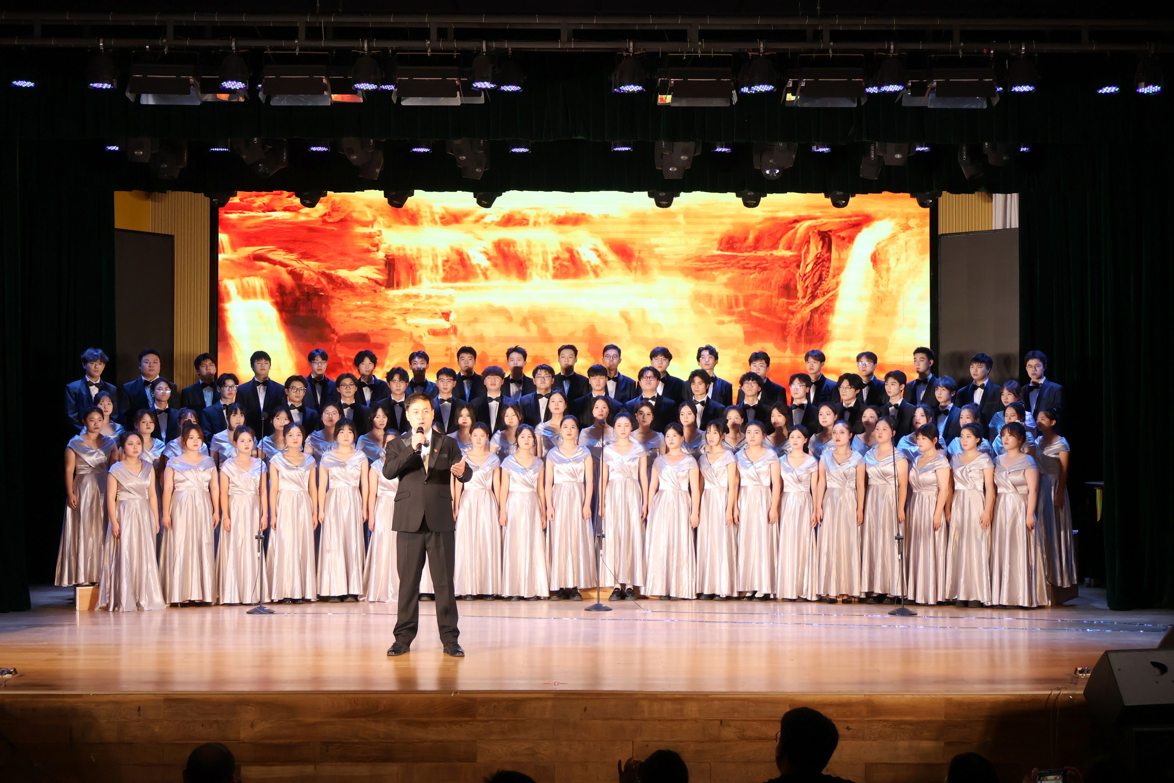 师生同台合唱,激情澎湃,歌颂了中华民族悠久的历史,共同回溯了党的光辉足迹,感受了那份在革命烽火中淬炼出的坚定与执着,让心灵在红色旋律中得到洗礼和升华。