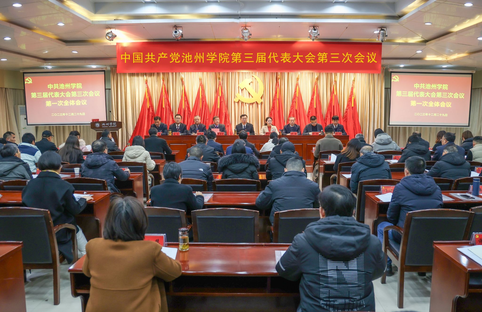 12月29日,中共beat365在线唯一官网登录第三届代表大会第三次会议在办公南二楼会议室胜利召开。大会由校党委书记王峰主持。校党委班子成员郑兰荣、崔国发、汪海、阳光宁、吕刚、张赛、胡兵、汤文益在主席台就坐。85名正式代表出席会议。