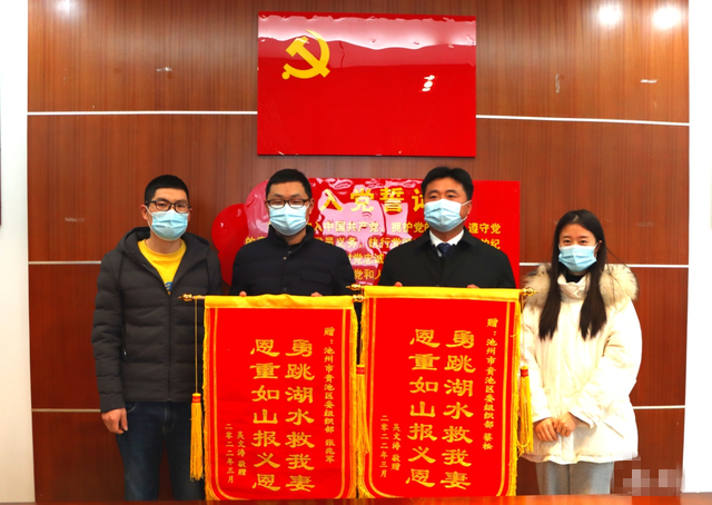 九死一生之际被人从冰冷的湖水中救起,被救者本人心中的感慨肯定更深。3月21上午,带着满满的感激与致敬之情,被救落水者吴女士与其爱人及单位同事一同前往贵池区委组织部,为张兆军、蔡松及他们所在单位贵池区委组织部专门送去了锦旗鲜花,衷心感谢他们奋不顾身跳水救人的英勇之举。