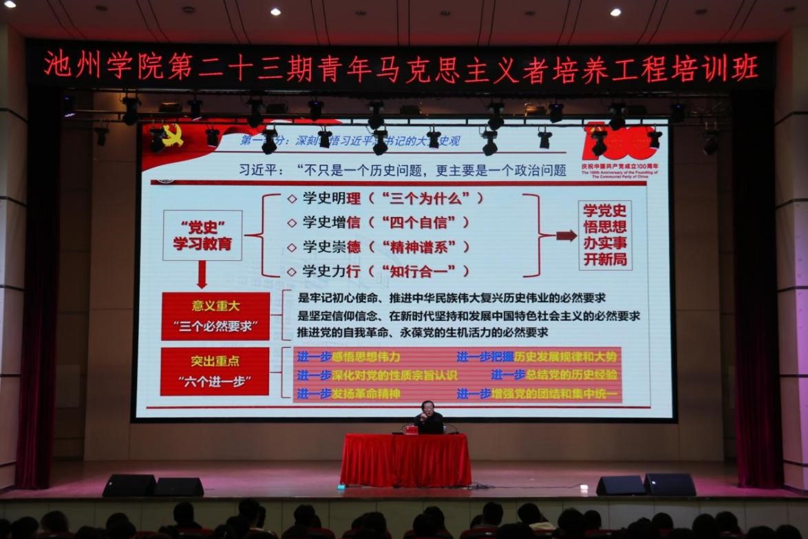 孙晓峰以题为《向历史致敬,向未来出发》,从深刻领悟习近平总书记大党史观、跨越时空看中共与中国社会进步、中国共产党百年发展的经验启示、高校要用中共党史涵育时代新人等四个方面,深刻阐释了习近平总书记“七一”重要讲话和十九届六中全会精神;回顾了中国共产党和中国社会的发展历程,以及从百年党史中汲取的经验和启示。他指出,中国共产党的历史是一部丰富生动的、最有说服力的教科书,要知史爱党、知史爱国,充分发挥党史以史鉴今、资政育人的作用。他强调,要始终坚持科学的理论指导,坚定理想信念。要始终坚持以人民为中心,坚持人民利益至上。要善于学习不断增强本领,用党史涵育时代新人,做“对的教育、好的教育、强的教育”,不断把beat365建设成特色鲜明的地方应用型高水平大学。孙晓峰号召全体学员,要学史明理、学史增信、学史崇德、学史力行,在党的百年奋斗重大成就和历史经验中寻找青春共鸣,在新时代新征程上书写青春华章。