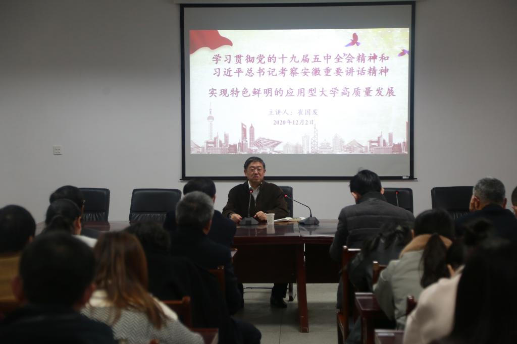 崔国发指出,要全面准确把握党的十九届五中全会精神和习近平总书记在安徽考察时重要讲话精神,切实把学习贯彻党的十九届五中全会精神和习近平总书记考察安徽重要讲话指示精神落到实处,深入谋划学校“十四五”发展规划,强化高质量发展和干事创业的担当作为。