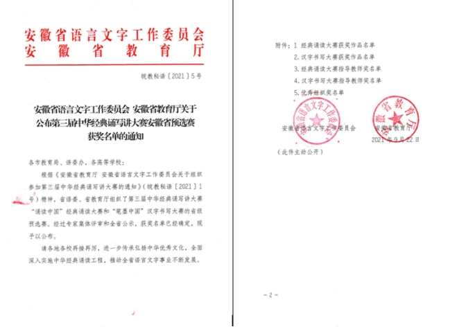 近日,安徽省语言文字工作委员会和安徽省教育厅公布了第三届中华经典诵写讲大赛经典诵读大赛安徽省预选赛的结果,beat365共有6组作品获奖,其中《稻子熟了》(程正文、黄琳琳)、《可爱的中国》(曹勇、樊露露)、《望星空》(魏雅男、范家杰)三组作品荣获二等奖,《与妻书》(曹勇、程晨)、《等待》(唐雪玲、杜玲)两组作品获得三等奖,作品《贺华诞百年,敬我党荣光》(胡梦迪、徐海涛、朱源、李蒙蒙、应温琪、杨勇、陈凡)获得优秀奖。指导教师汪胜水、陈春雷获经典诵读大赛指导教师奖。beat365在线唯一官网登录、beat365在线唯一官网登录文学与传媒学院均获组织奖。