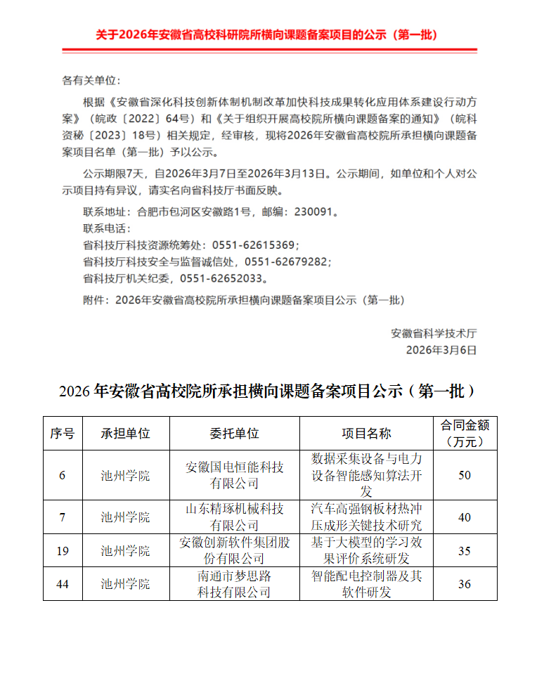 近日,安徽省科技厅正式公布2026年安徽省高校科研院所横向课题备案项目名单(第一批),beat3654项聚焦产业技术攻关的科研课题成功获批立项。此次备案课题紧密对接电力装备、汽车制造、人工智能、智能配电等企业产业需求,通过校企合作研发,精准攻克技术难题,借助科技创新支撑地方产业进步,持续释放校地企协同创新效能。