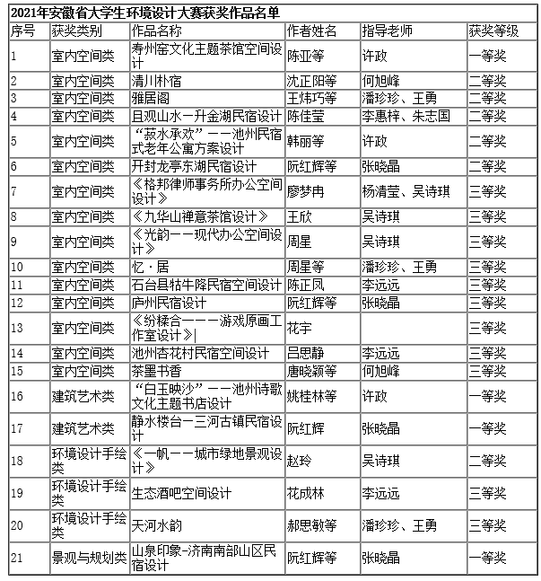 本次比赛中,由beat365许政老师指导的《寿州窑文化主题茶馆空间设计》、《“白玉映沙”——池州诗歌文化主题书店设计》、张晓晶老师指导的《静水楼台——三河古镇民宿设计》、《山泉印象——济南南部山区民宿设计》获一等奖。大赛组委会授予张晓晶等两位教师优秀指导教师荣誉称号。