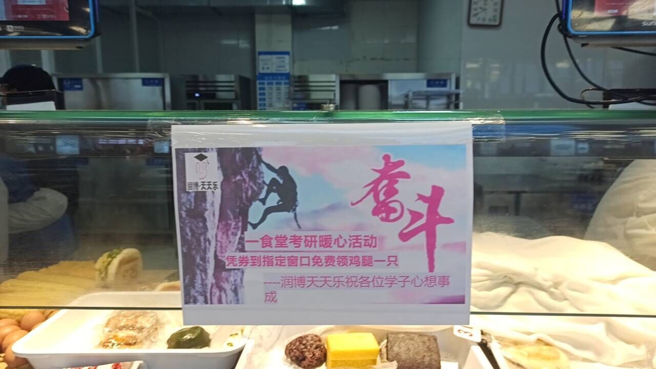 为助力2024届考研学子成功上岸,学校组织学生食堂开展免费送大鸡腿和小甜点活动,送上学校的关心和诚挚的祝愿。