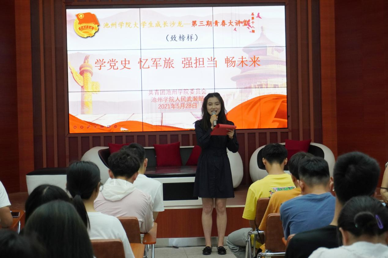 机电工程学院陈啸、体育学院吴伟、吴钦渊、纪帅和陈棠镇,旅游与历史文化学院樊雨六位同学作为主讲嘉宾,分别讲述了携笔从戎的难忘经历,分享军旅生活中的故事与感悟,号召同学们认真学习党史知识,知史爱党、知史明志、知史担责,努力成为堪当民族复兴重任的时代新人。