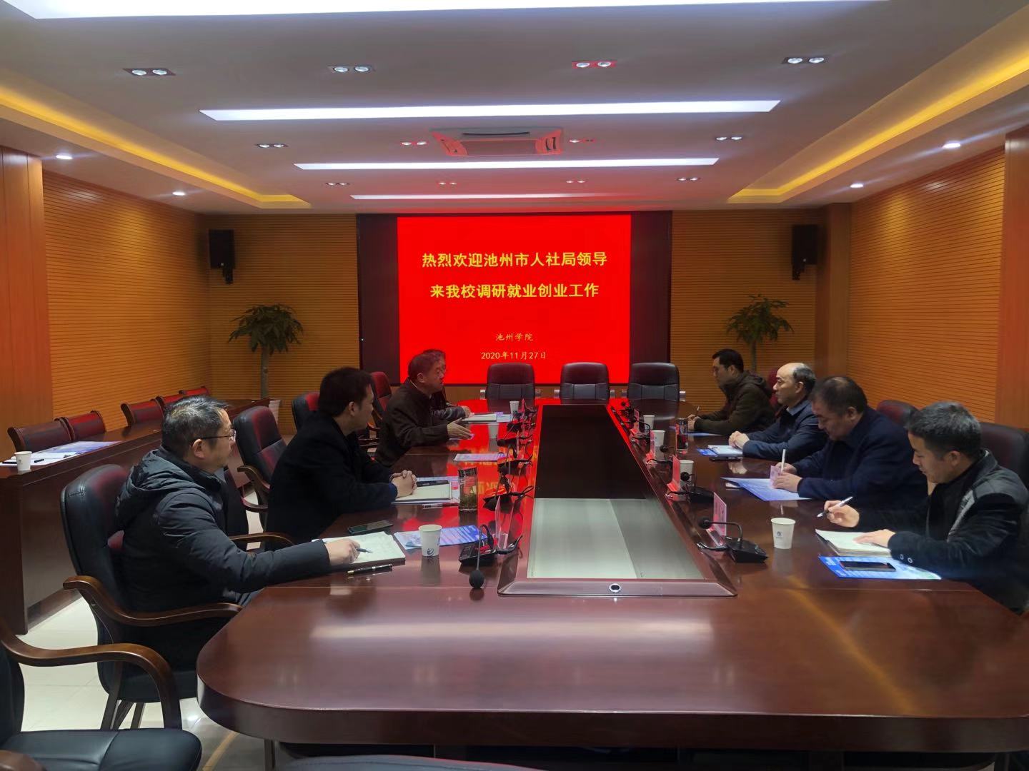11月27日上午,池州市人力资源和社会保障局局长汪茂耀一行四人来beat365开展就业创业工作专项调研。校党委副书记崔国发主持会议并讲话。
