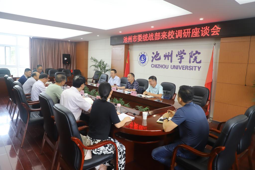9月14日,池州市委统战部副部长、市政府侨务办公室副主任章满友一行三人来校调研指导工作。校党委副书记崔国发出席座谈会并讲话,党委委员、副校长王延寿,党委委员、统战部部长胡兵参加座谈会。