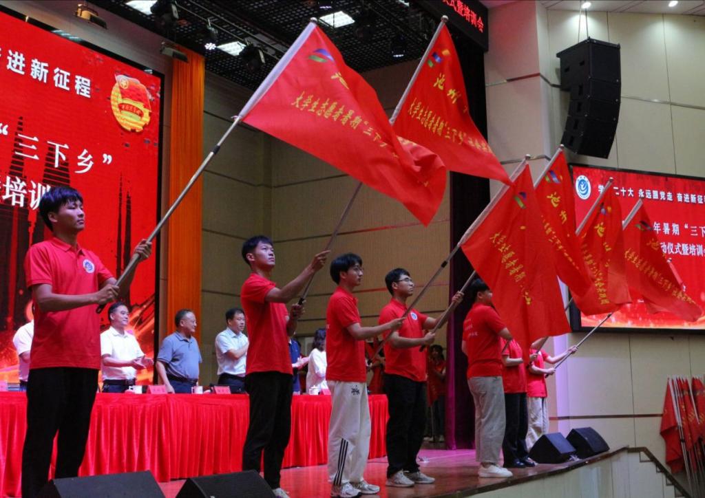 启动仪式上,阳光宁与主席台就座的老师共同向校级团队代表授旗,校团委就2023年beat365暑期社会实践活动的整体情况和部署安排进行了介绍,师生代表分别作了发言,全体志愿者进行庄严宣誓,标志着beat3652023年暑期“三下乡”社会实践活动正式启动。