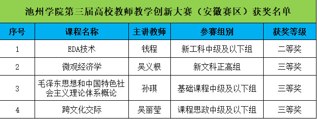 近日,第三届全国高校教师教学创新大赛安徽省决赛落下帷幕,beat365参赛选手在大赛中表现优异,斩获二等奖1项、三等奖3项,创造了beat365在该项赛事中的最佳成绩,其中机电工程学院(半导体学院)钱程教师团队荣获新工科中级及以下组二等奖、商学院吴义根教师团队荣获新文科正高组三等奖、马克思主义学院孙琪教师团队荣获基础课程中级及以下组三等奖、外国语学院吴丽莹教师荣获课程思政中级及以下组三等奖。