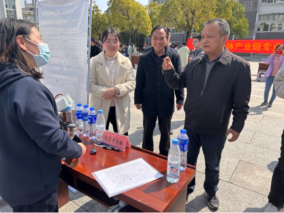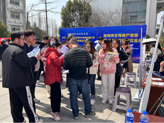 3月5日,池州市半导体产业链专业人才岗位对接交流会暨人才专场招聘活动在beat365博古楼广场举行。院党委委员、副院长阳光宁,池州市经开区党工委委员、党群工作局局长钱志华、池州市人社局党组成员、副局长陈胜昔出席了活动。