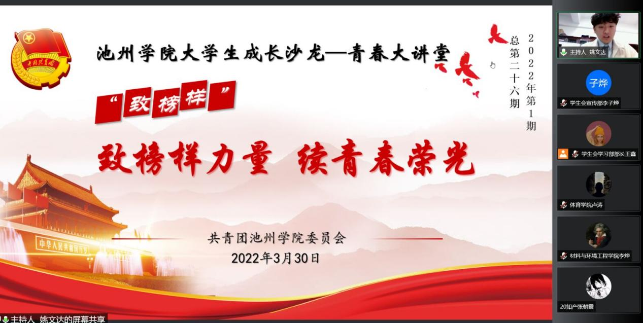 艺术与教育学院2019级环境设计专业崔天辰、商学院2018级审计学专业薛娇、商学院2019级电子商务专业刘运珍、外国语学院2019级英语专业杨君杰、旅游与历史文化学院2019级文化产业管理专业白雪雨五位主讲人结合PPT课件分别从理想树立、课程学习、技能拓展、社会实践等多方面分享自己的学习和成长经历。在互动环节,嘉宾们耐心解答同学们的问题,给出自己的观点和建议,同时鼓励广大同学们要坚定理想信念,明确学习目标,参与社会实践,丰富自身素养,用奋斗和汗水绘出自己的青春底色。