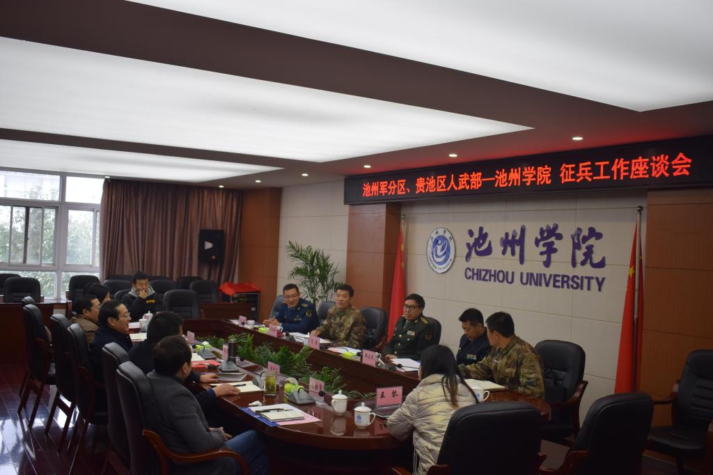 12月15日上午,池州军分区司令员贡建、副司令员韩立民、动员处处长渠胜红以及贵池区人武部政委冯涛、部长夏阳等一行来beat365调研征兵工作。院党委书记孙晓峰主持座谈会,院党委委员、副院长汪贤才参加会议。