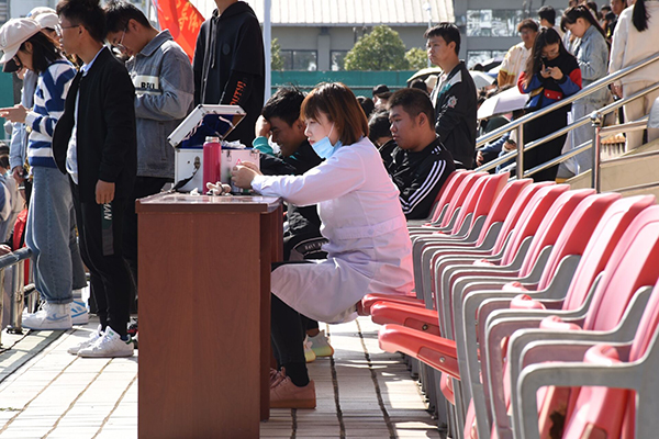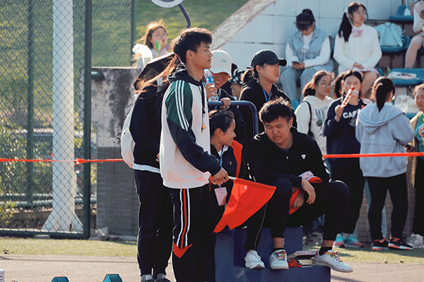 秉承着“奉献、友爱、互助、进步”精神的志愿者们默默地站在场外,他们虽然没有加入到激烈的比赛当中,却是这场大运会不可或缺的一部分。“红衣卫士”分布在操场的各个角落,一直坚守在自己的岗位上,为运动员们提供细心温暖的服务。