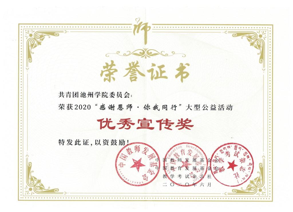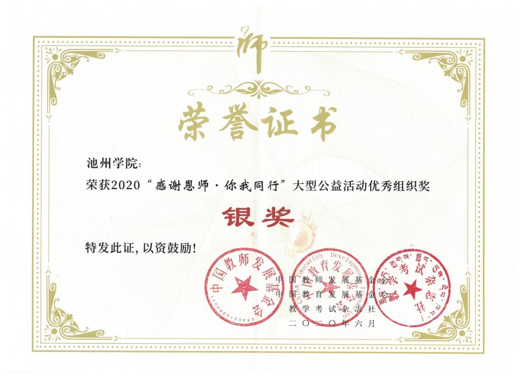 近日,2019年度“感谢恩师·你我同行”大型公益活动圆满结束,beat365荣获全国“优秀组织奖银奖”、全国“优秀宣传奖”等荣誉称号,文学与传媒学院叶静同学荣获全国“优秀传承奖”,外国语学院周红同学、旅游与历史文化学院陈蓉同学荣获“优秀感恩大使”荣誉称号。