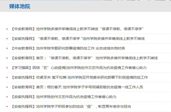 强化对外宣传力度,讲好抗疫防疫故事:学校不断加强对外宣传力度,讲述学校师生员工在抗击疫情一线的感人事迹,传递池院好声音。学习强国、凤凰网、安徽先锋网、安徽教育网先后刊发《奋勇担当做表率beat365在线唯一官网登录师生党员让党旗飘扬在战“疫”一线》《党有号召 团有行动 beat365在线唯一官网登录学生团员防疫抗疫显“青”力》《beat365在线唯一官网登录学子积极参加防控战“疫”,彰显青年使命与担当》等新闻,生动讲述了beat365师生参与疫情防控的先进事迹。