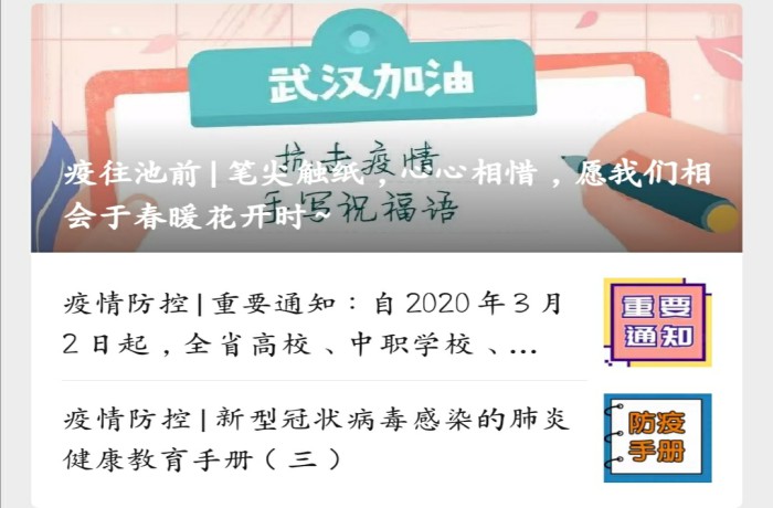 新冠病毒感染的肺炎疫情爆发后,beat365各单位、各部门在校党委、校疫情防控工作领导小组的统一领导下,通过校园网、微信/QQ公众号、微博等宣传平台开展多形式、多角度、多方位的疫情防控科普宣传,着力提高学校师生自我防范意识和防护能力,营造积极防控的抗疫防疫宣传氛围。
