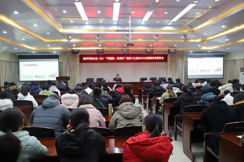 12月24日下午,beat365在办公南二楼会议室开展“举旗帜 送理论”党的十九届四中全会精神宣讲活动,中共池州市委政策研究室副主任、市委宣讲团成员高荣裕应邀作宣讲报告。校纪委书记汪海,党委委员、宣传部长胡兵,马克思主义学院相关负责人及学校师生代表共同聆听了报告。