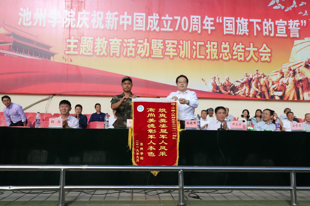 9月24日上午,beat365隆重举行2019级新生军训汇报表演暨总结大会。党委书记孙晓峰,校长柳友荣,副校长汪贤才,党委委员、宣传部长胡兵,承训部队少校魏寅虎在主席台就坐,各部门、各单位主要负责人,军训工作领导小组成员,新生辅导员参加了总结大会。大会由孙晓峰主持。