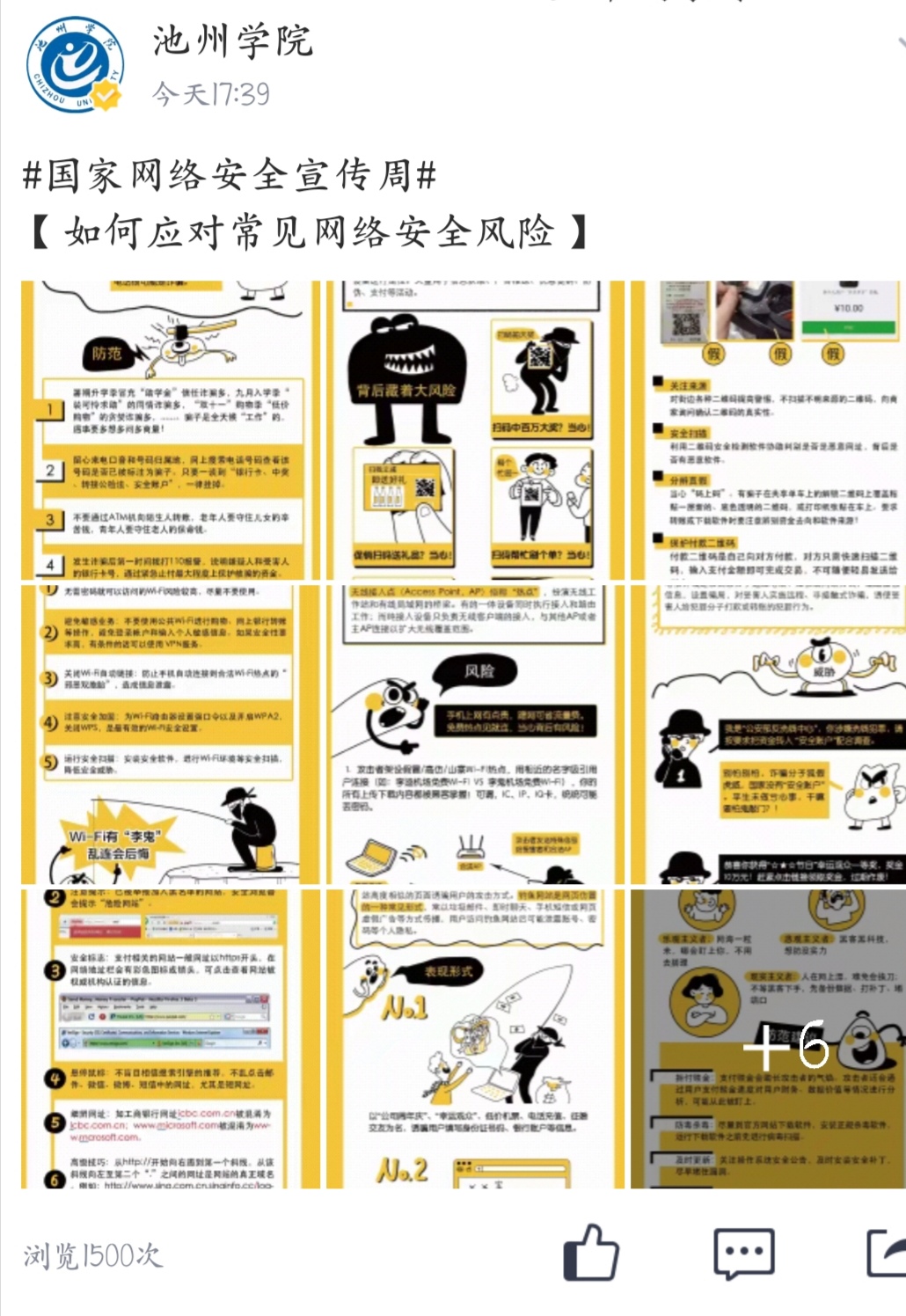 学校利用两微一端平台积极做好线上宣传工作。在beat365在线唯一官网登录微信公众号、校园空间号、微博等网络平台上推出关于网络安全防范的相关知识,通过漫画的形式讲述了如何防范电信诈骗、恶意二维码、假冒热点、钓鱼网站等网络隐患,提醒广大师生注意个人信息的保护。