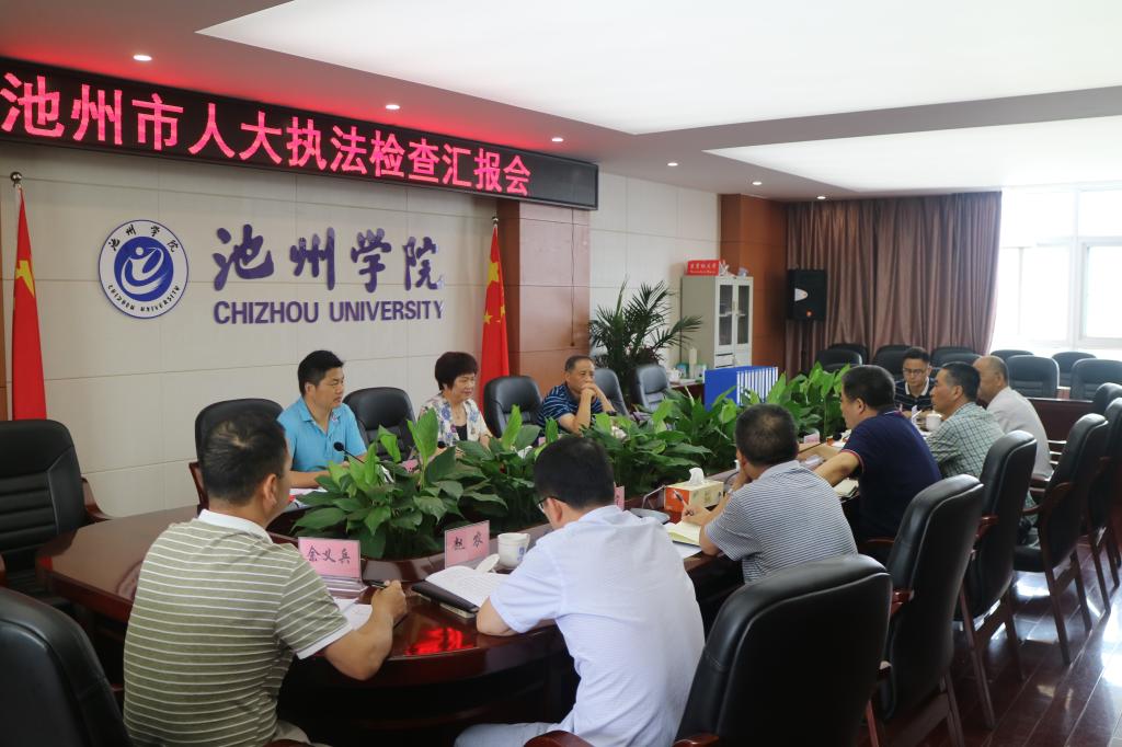 柳友荣代表学校对检查组的到来表示欢迎和感谢。他表示,近年来在省委、省政府的正确领导下,在省人大的监督支持下,学校教育工作始终坚持以习近平新时代中国特色社会主义思想为指导,以立德树人为宗旨,以建设特色鲜明的应用型大学为目标,不断加大投入、深化改革,促进了学校各项事业持续快速健康发展。学校坚定扎根池州、服务安徽的办学理念,为服务池州经济社会发展做出了应有的贡献。柳友荣从落实党委领导下的校长负责制、人才培养质量、服务社会经济发展、教师队伍建设、考试招生制度改革、推进“放管服”改革,扩大办学自主权等方面汇报了学校贯彻落实《高等教育法》的基本情况,并介绍了学校在改革发展中面临的困难和问题。
