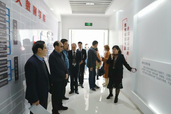 在大数据学院,钱桂仑一行参观了曙光大数据展厅、师生工作室,详细了解学生培养、学生管理和科研创新以及行业应用等方面情况。钱桂仑对大数据学院着重于人才培养、科学研究和为地方发展提供智力支持充分肯定。