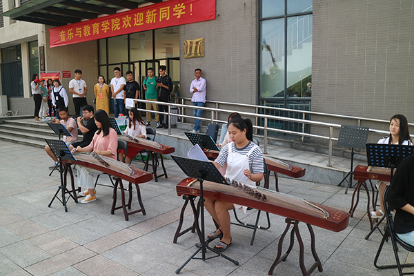 在报到点,二级学院也是充分发挥自身特色,将独特的学院文化融入到迎新工作之中,成为迎新工作中的一道靓丽风景。音乐与教育学院的民乐现场演奏和儿童画、手工作品展,旅游与历史文化学院的暖心留影墙,商学院的党员志愿服务队伍,化学与材料工程学院的考研光荣榜,外国语学院将新生和家长的合影打印成明信片,文学与传媒学院为新生准备的文化大礼包等等,都给新生与家长留下深刻的印象。