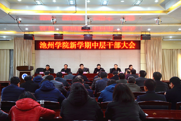 2月26下午学校在行政南二楼会议室召开新学期中层干部大会。领导柳友荣、孙晓峰、王延寿、汪海、阳光宁、汪贤才出席会议,全体中层干部参加会议。会议由校党委副书记孙晓峰主持。会议以迎评为主题,全面部署2018年工作。