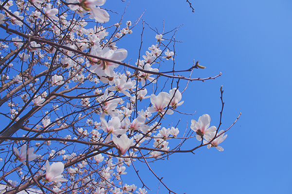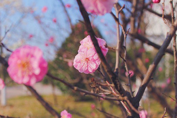 “人面不知何处去,桃花依旧笑春风。”花儿竞相绽放,一朵朵,一片片,四处氤氲着花的香气。树下来往的同学们也禁不住停下脚步,深吸一口春的气息。