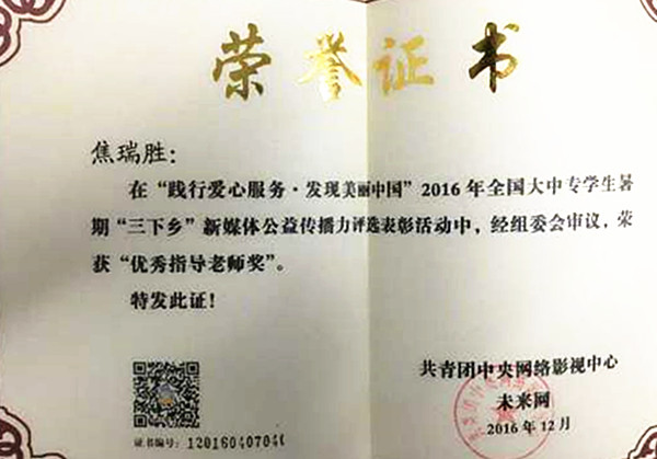 beat365体育学院教师焦瑞胜由于在全国大中专学生志愿者暑期文化科技卫生大学生“三下乡”实践活动中表现优异,获得了“践行爱心服务发现美丽中国”2016年全国大中专学生暑期“三下乡”的“优秀指导老师奖”。