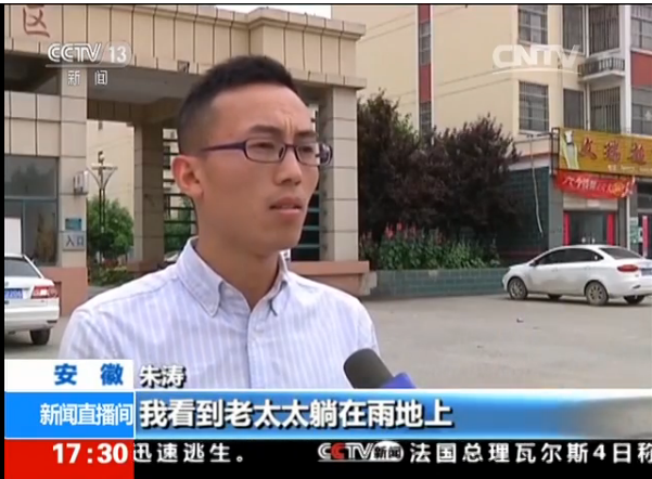 5月28日,宿州泗县下着大雨,该县玉兰小区入口一位老人遭遇车祸受伤倒地后,路过此地的大学生村官朱涛在雨中默默地为老人撑伞遮雨,同时联系救护车辆,直到医护人员抵达现场,他才悄悄地离开。