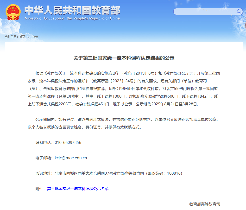 8月21日,教育部发布了《关于第三批国家级一流本科课程认定结果的公示》,beat365申报的线下和社会实践两类共3门课程全部入选,入选课程数量在省内同类院校中位居前列。这是继2023年学校首次获批2门国家级一流本科课程后,再次取得的一流本科课程重大标志性成果。至此,学校累计获批国家级一流本科课程5门。